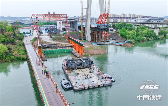 成達萬高鐵遂寧涪江特大橋水上箱梁吊裝(王晨光 攝)